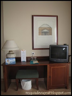La nuestra era una habitación doble superior y era muy amplia y luminosa. Una gran entrada, buen armario y mueble auxiliar, un baño muy completo, dos camas individuales juntas, escritorio con tv, mesa y minibar, pequeña sala de estar con sofá y mesita y una terraza amplia con vistas al pinar y a la playa.