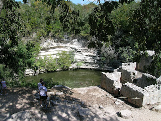 La excursión a Chichen te lleva el día completo e incluye comida y visita a un cenote( cueva con aguas). En la furgoneta vamos unos americanos de Kentucky, una pareja de Israel y nosotros. Solo nosotros hablabamos español. Y nuestro chofer, un conductor suicida mexicano que no paró de preguntarme cosas sobre España. La carretera estaba en un estado pésimo, llena de baches y muy estrecha. Tardas unas 3 horas en llegar por esta carretera. Hicimos una parada en Valladolid para estirar las piernas y visitar su iglesia. Allí compramos unos calendarios mayas de cuero muy baratos. La ciudad no es muy grande, casas bajas y barrios muy humildes.