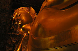 De allí nos dirigimos al Wat Po, otro famoso templo que está a muy poca distancia del Palacio Real. Salimos y compramos agua por 20 baths. Estamos sudando mucho y la furgoneta nos recoge. Nos dan unas toallitas húmedas muy fresquitas y nos refrescamos un poco. Se agradece tanta atención. En dos minutos estamos en el templo del Buda reclinado( Wat Po) una de las estatuas más bellas que he visto.