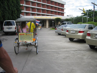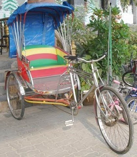 Llegamos a la ciudad y nos bajamos en una plaza. Allí nos esperan en Trishaws, bicicletas para llevar a un pasajero, para darnos un paseo hasta el hotel. Es un transporte típico de aquí en donde sólo cabe una persona.