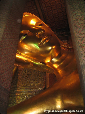 – Wat Po, o templo del Buda reclinado. Es el templo más antiguo de Bangkok, del siglo XVI. Es famoso por su Buda reclinado de 46 metros y 15 de alto que representa a Buda en estado de nirvana. Está hecho de ladrillo y argamasa cubiertos por pan de oro y sus pies están hechos de nácar con incrustaciones de madreperla. Además es famoso por tener la escuela de masaje tradicional. Imprescindible.