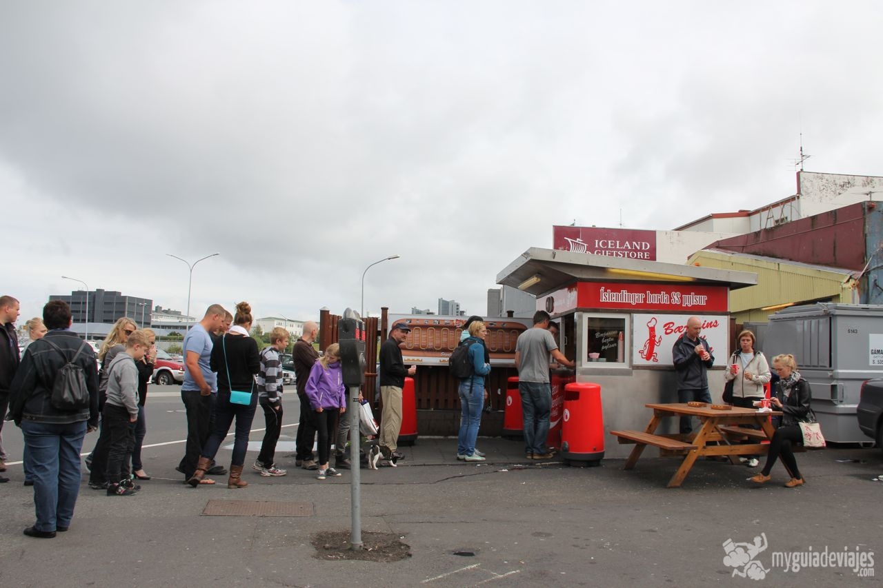 El pequeño puerto tiene a su alrededor bastantes restaurantes donde probar la gastronomía local y desde aquí se pueden hacer excursiones en barco para avistar ballenas con distintas compañías ( aunque no te aseguran que las verás así que la apuesta más segura es Husavik, al norte del país). Justo al lado del puerto está Baejarins Beztu, los «mejores perritos calientes del mundo». No lo digo yo, que no soy nadie. Lo dijo nada más y nada menos que el ex presidente del gobierno americano Bill Clinton en su visita a Reikiavik. Os podéis imaginar que desde entonces este pequeño puesto junto al puerto sufre largas colas para degustar sus famosos «pilsa» de carne de cordero, cebolla frita y salsa de mostaza dulce. La verdad es que están riquisímos, los mejores que hemos probado en toda Islandia ( y os confieso que en mi dieta islandesa han abundado los perritos…). Este pequeño puesto junto al puerto se ha hecho tan famoso que todo el mundo quiere probrarlos y hay que hacer largas colas. Por supuesto hay que pedirlos completos y comerlos de pie porque la mesa existente no da para tanta gente. Comida callejera que nos hará ahorrar algo en esta ciudad tan cara. Este video prueba que nos encantaron.